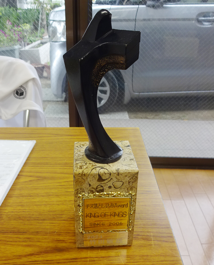 | 歴代の優勝者の名が刻まれる優勝トロフィーを、受け取る浜田選手 |
